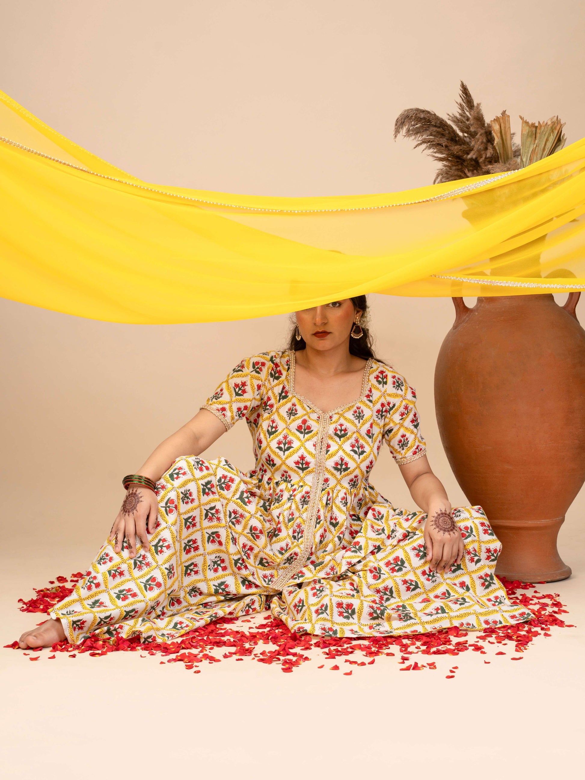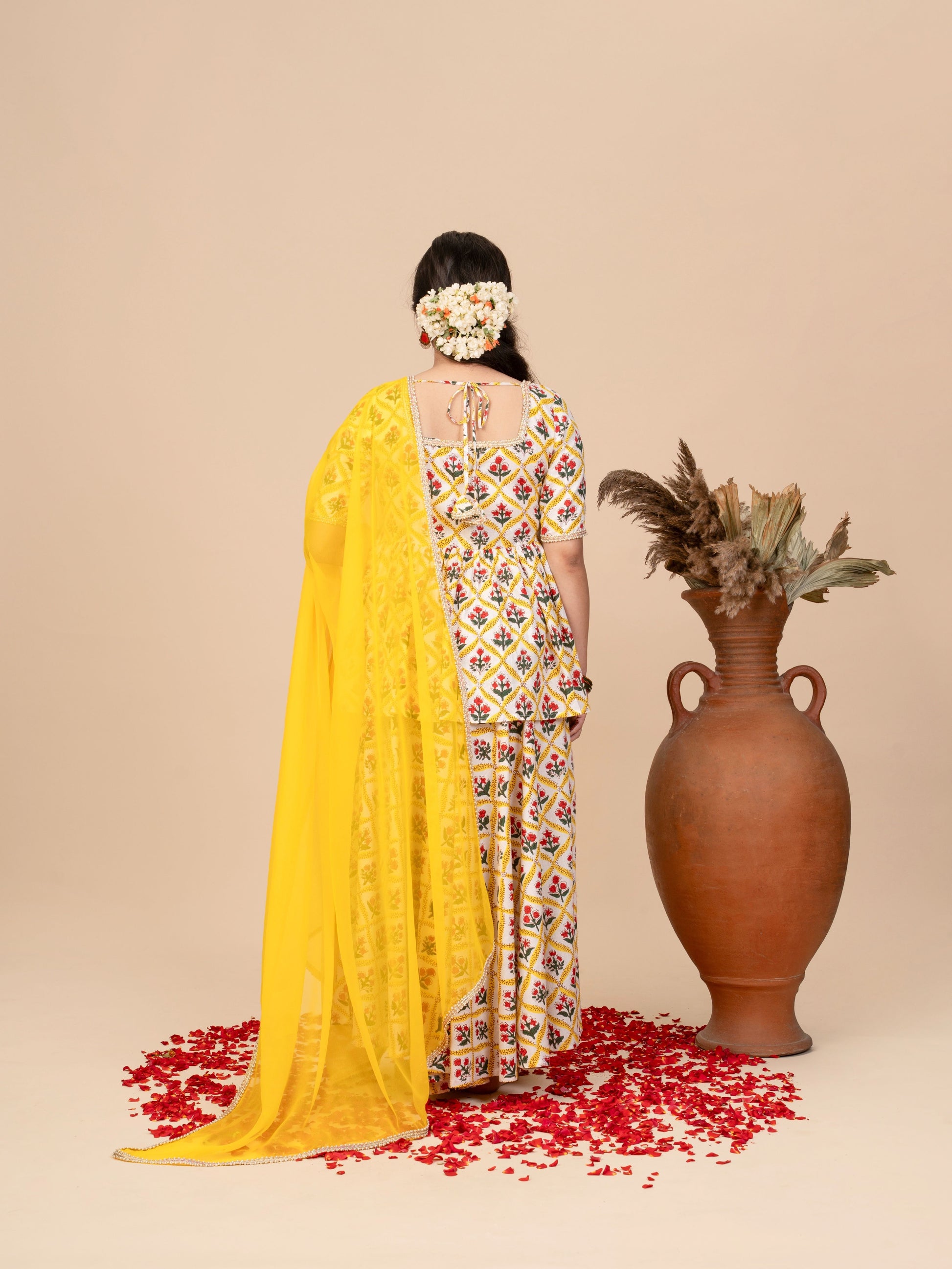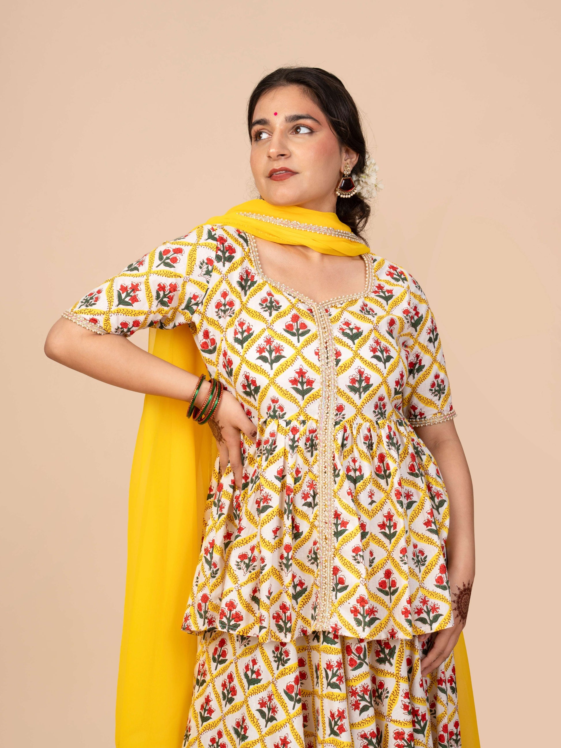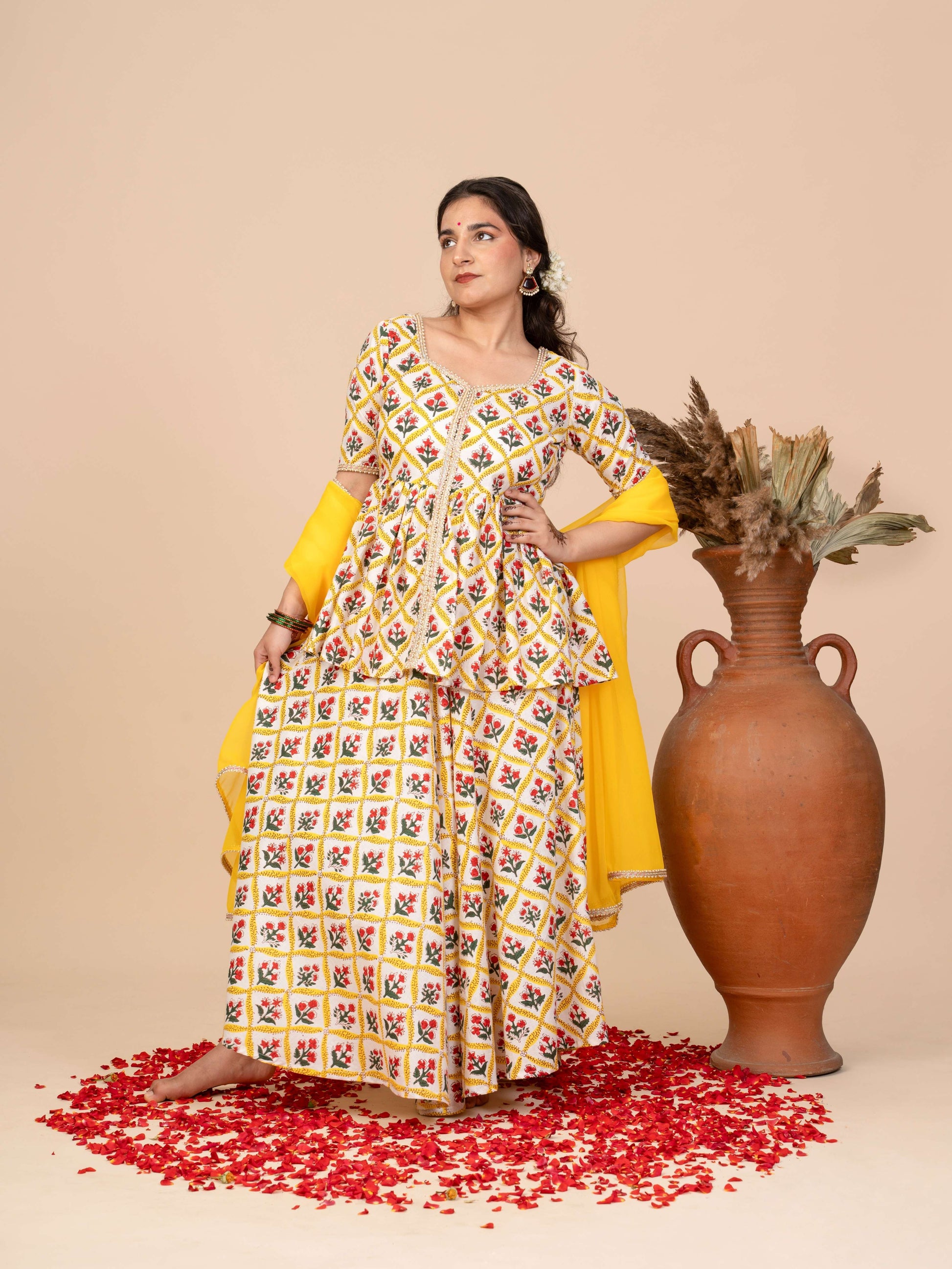 Inspired by the gentle, soulful notes of “Ambarsariya,” this sunshine-yellow gharara set with a georgette dupatta brings the warmth of summer afternoons to your wardrobe. The peplum top, adorned with delicate, vertical prints, falls softly around the waist, while the flared gharara sways with every step, echoing a natural, effortless rhythm.