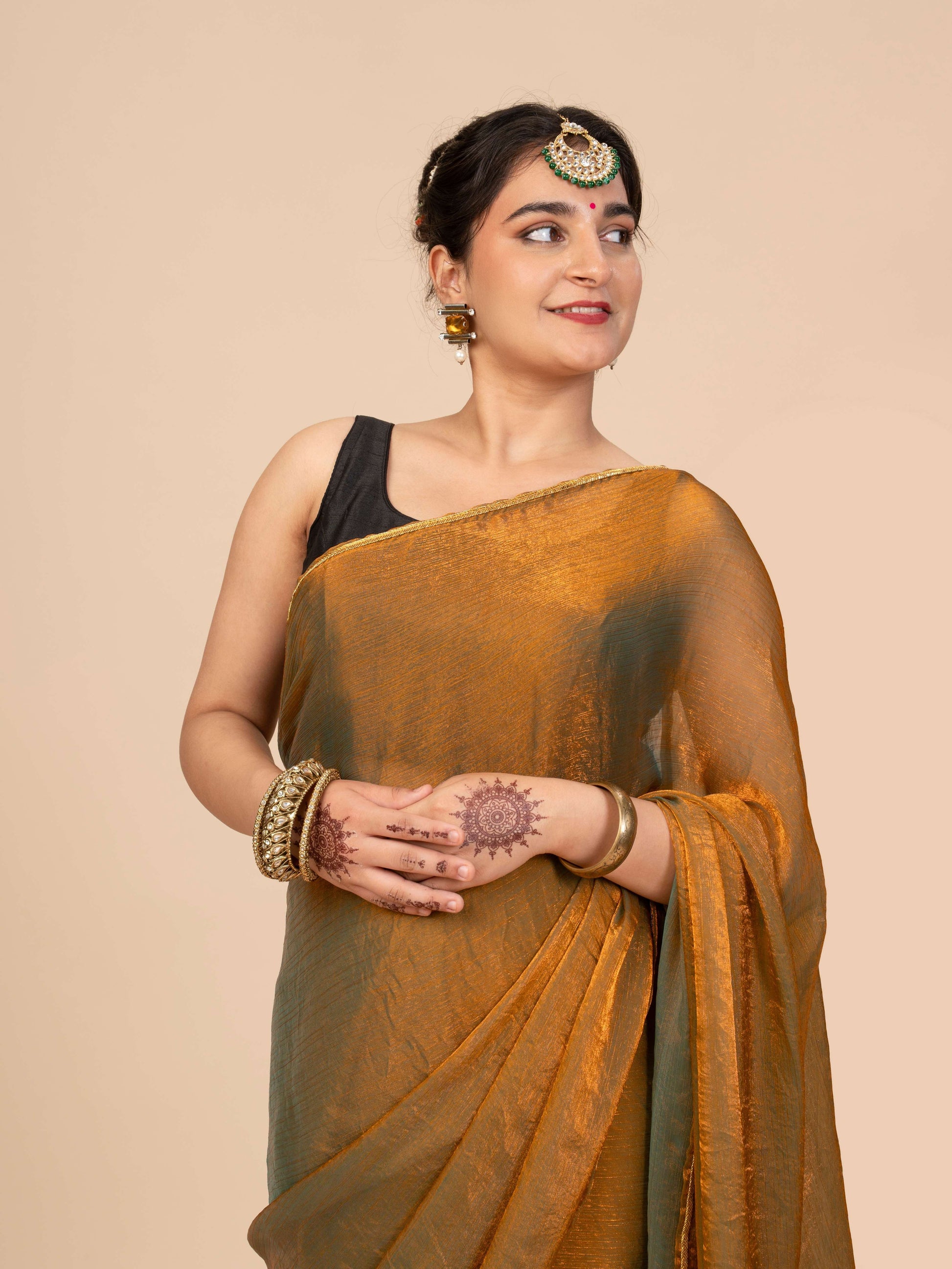 The Banarasiya saree, much like the song it borrows its name from, carries a quiet grace that lingers. Crafted in luminous polysilk, its golden hue with a gentle green undertone catches the light in subtle shifts, creating a look that feels festive yet refined.