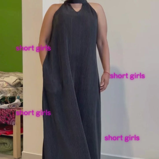 Petite women hardly ever had maxi dresses ending at the ankle. This dress in pleated fabric creates vertical lines, and therefore an elongating effect.